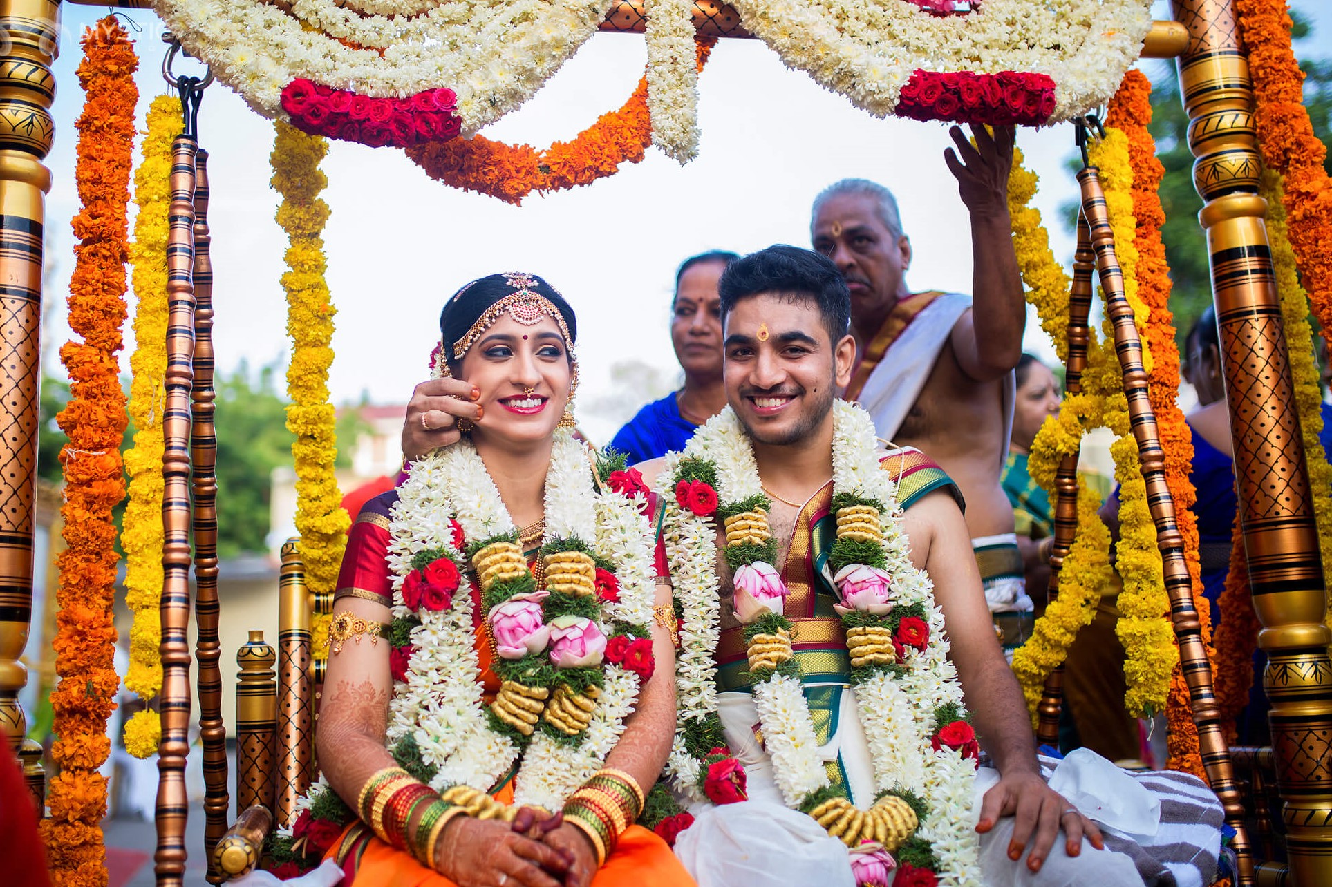 The bride’s parents wait outside the marriage hall with coconuts, flowers, and Thamboola with two conical structures called ‘Paruppu Thengai Urundai” (made of Dhal, jaggery, coconut) to receive the groom and his family for the wedding.